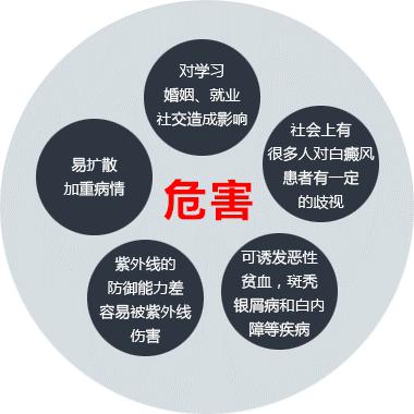 很多患者觉得白癜风并不是很严重的疾病,就没有积极此案去治疗。白癜风的症状对于患者的外貌影响是很大的,头脸部白癜风患者来说,影响着患者生活的方方面面,白癜风扩散严重的话很容易导致白斑扩散至全身,还有会诱发很多的并发症,对身体健康危害是很大的,不能忽视。